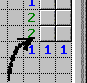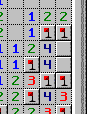 Jetzt ist klar: Das Feld rechts neben der markierten Mine kann keine Mine sein, wegen der rechten und der mittleren Eins! In direkter Umgebung dieser Einsen gibt es nur eine Mine, und die ist ja schon "entdeckt". Also kann man dieses Feld mit der linken Maustaste aufdecken.