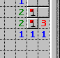 Und weiter kann man kombinieren: Das Feld direkt über der Mine muß auch eine Mine sein, weil links neben der Mine ja ne Zwei steht, und das ist das einzige Feld, das für diese zweite Mine noch in Frage kommt! Also: Mit rechter Maustaste markieren.